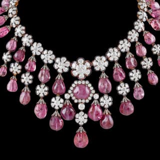 We focus on jewellery featuring precious gems, stones, and metals marked by fine craftsmanship. The category includes Gold Jewellery, Certified Diamonds, South Sea and Basra Pearls, Colombian Emeralds, Burmese Rubies, and Kashmiri Sapphires set in traditional styles such as Jadau, Meenakari, and Kundan. A rare diamond, ruby, pearl, and enamel guluband achieved a final bid of 1,52,22,392 INR.